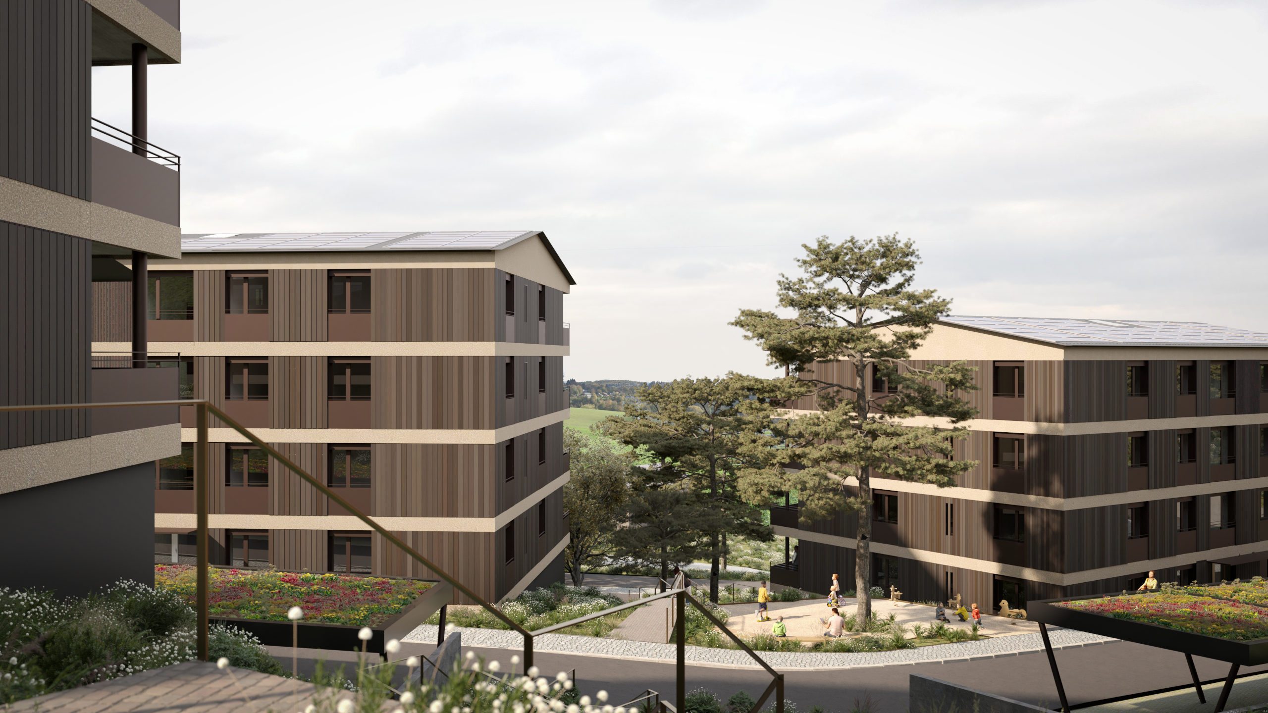 - Concept d’aménagements extérieurs favorisants les espaces naturels et l’intégration du quartier dans son environnement